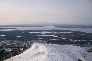 The next hike was in November and it was getting dark by then. We were hiking on a snowy evening in the dark. Headlamps are useful, but everything is white and the reflected light from the city and the sky makes it reasonably well lit even without. The night was beautiful and it was ghostly beautiful with the snow and the clouds and the fog and the light. Two adults and three young men made the ascent that evening. We adults were fortunate that the young men are patient with us. The lights of Eagle River and Anchorage make a beautiful sight from half-way up the mountain.