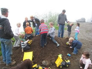 Carolyn and Curtis had a birthday party here for Cayden that was described by the mothers as "brilliant". They had me dump a couple of loader buckets of dirt in a pile and then invited the boys to a Tonka Truck Birthday Party. The kids brought their own Tonkas and dug in the dirt pile for hidden Hot Wheels. I was recruited to give loader rides to the kids, and afterwards they had cake and ice cream served from a dump truck in the garage. The perfect no-mess party.